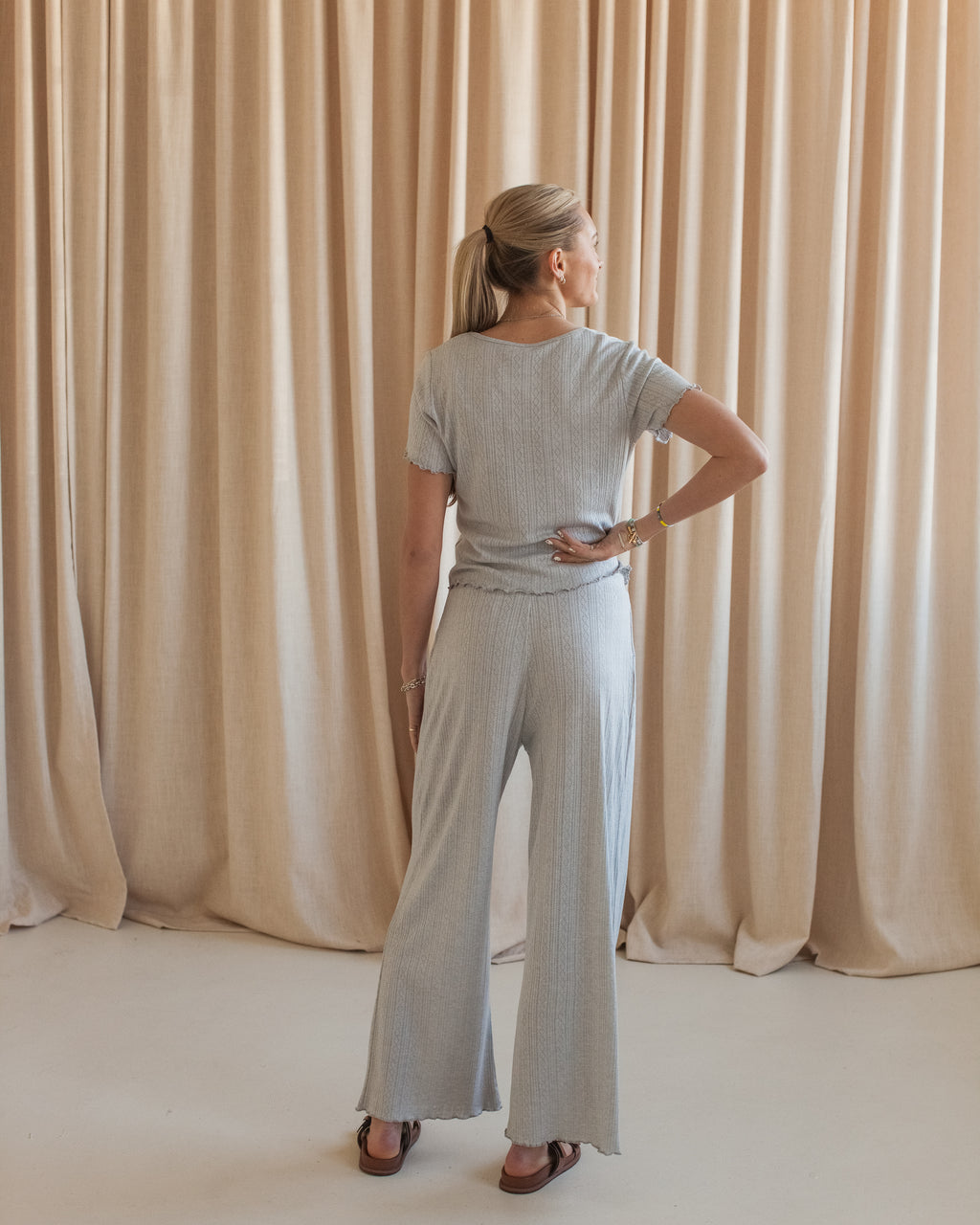 100% cotton, lightweight drawstring pants designed for everyday comfort. Featuring an adjustable waist, relaxed fit, and a ruffled hem for a subtle feminine touch. Pair with the Grey Pointelle Tee for a complete set.