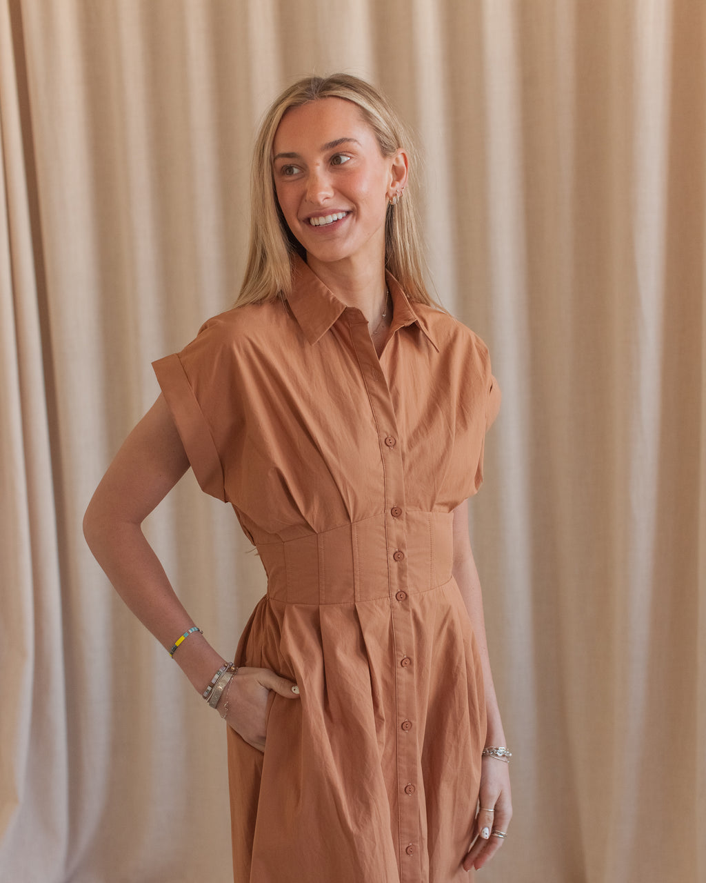 A classic button front shirt dress with short sleeves, pockets, and a wide fitted waistband. Pair with sandals or white sneakers to complete the look.