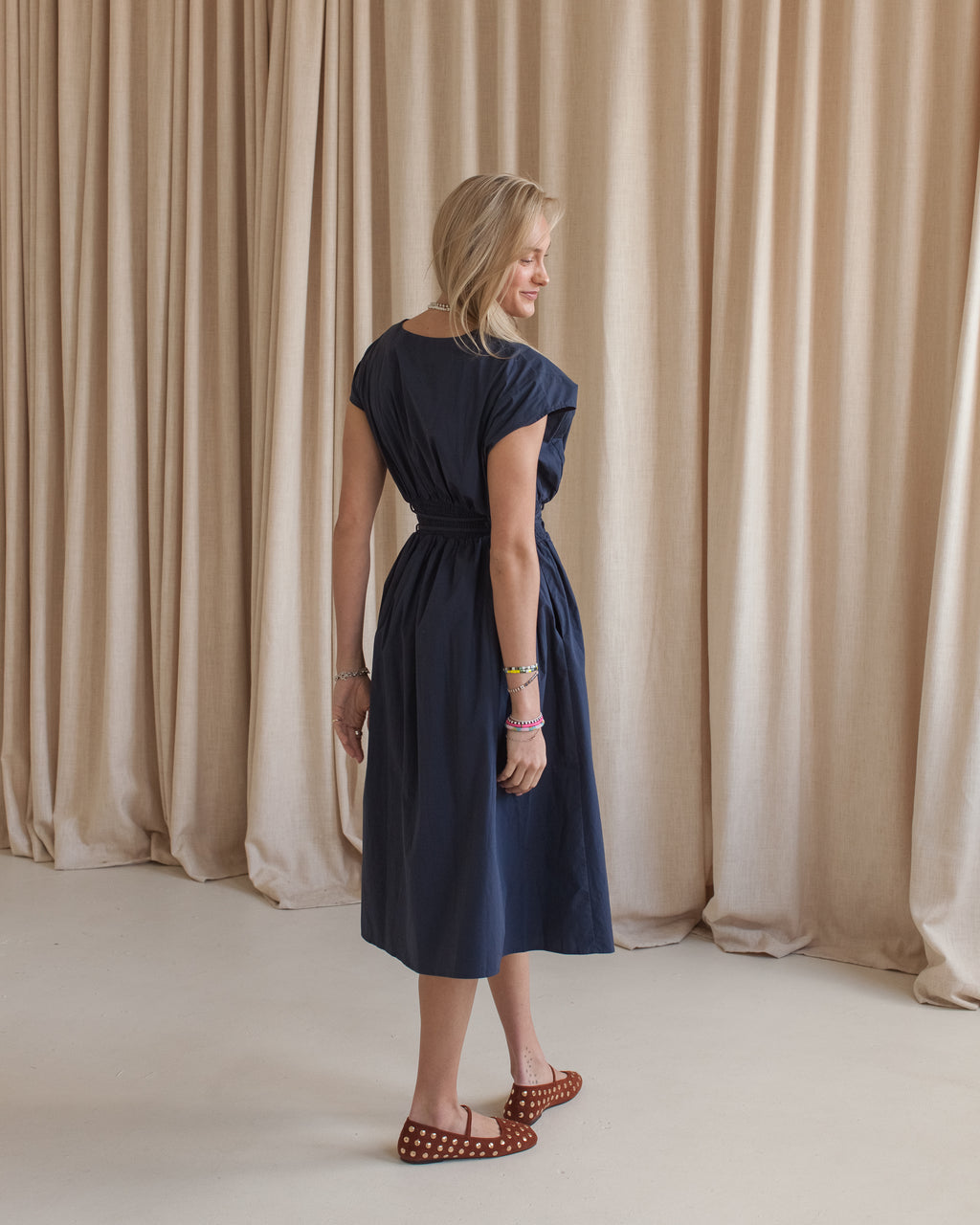 A 100% cotton midi dress featuring a flattering V neckline, cinched waist and adjustable tie belt for an easy, comfortable fit. Effortless and versatile for everyday wear or dressed up with accessories.
