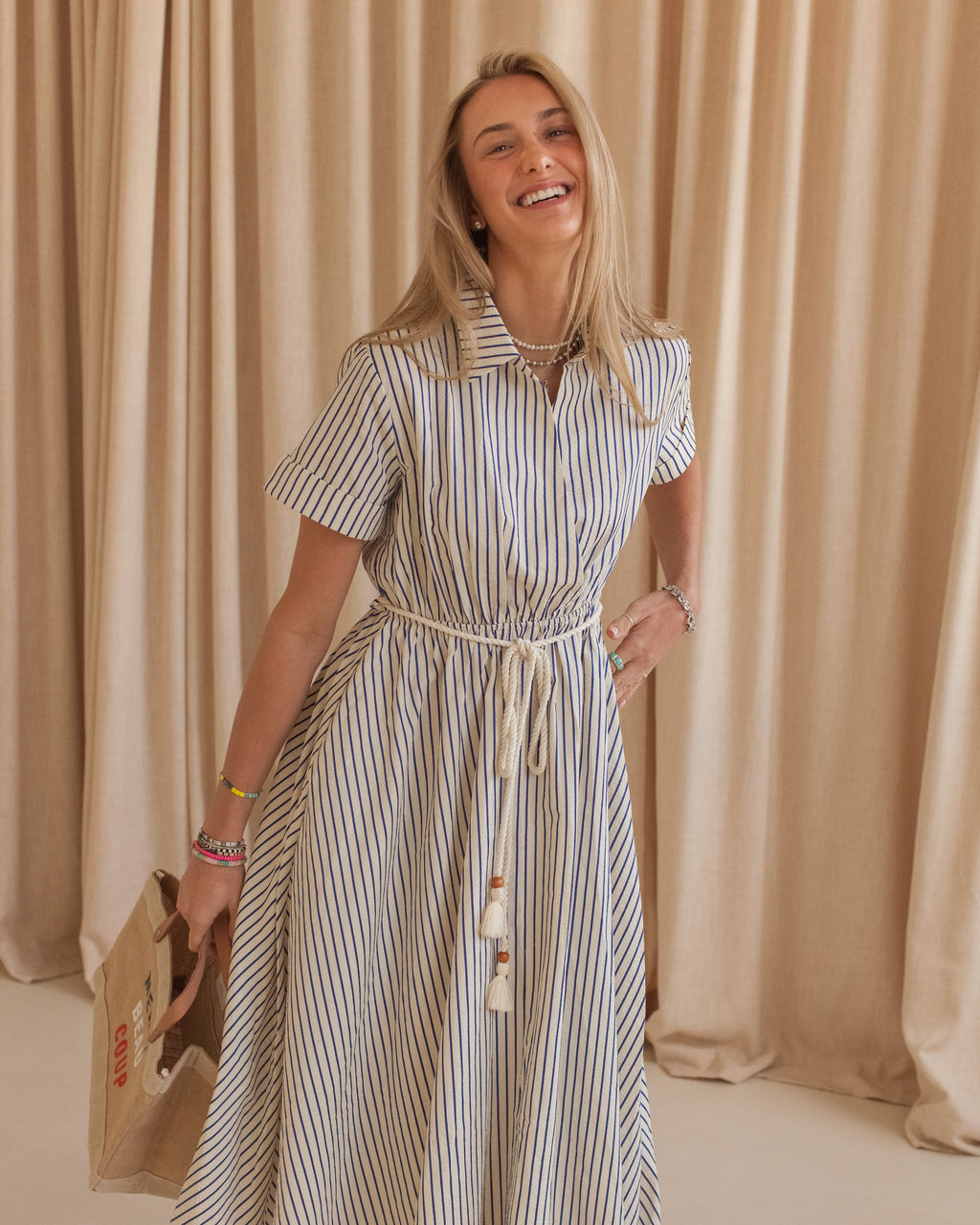 This striped midi dress features a polished collar, short sleeves and a nautical rope belt for a perfectly cinched waist. Pair with your favorite sandals.