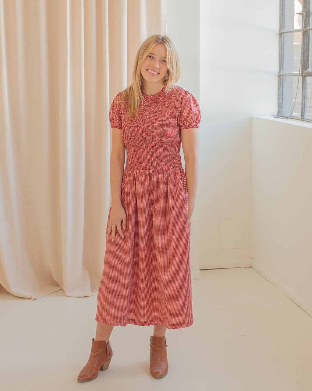A gingham midi dress with a smocked, form-fitting bodice and a flowing skirt that creates a flattering shape. Designed with short puff sleeves, and a ruffle-edged crew neckline. Pair with sneakers for the day or heels for a night out.