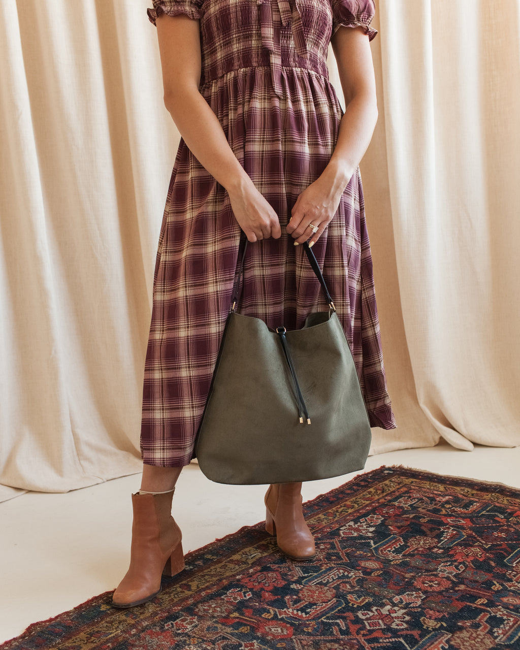 This suede bag is perfect to carry all your necessities. Featuring a magnet closure and inner pockets.