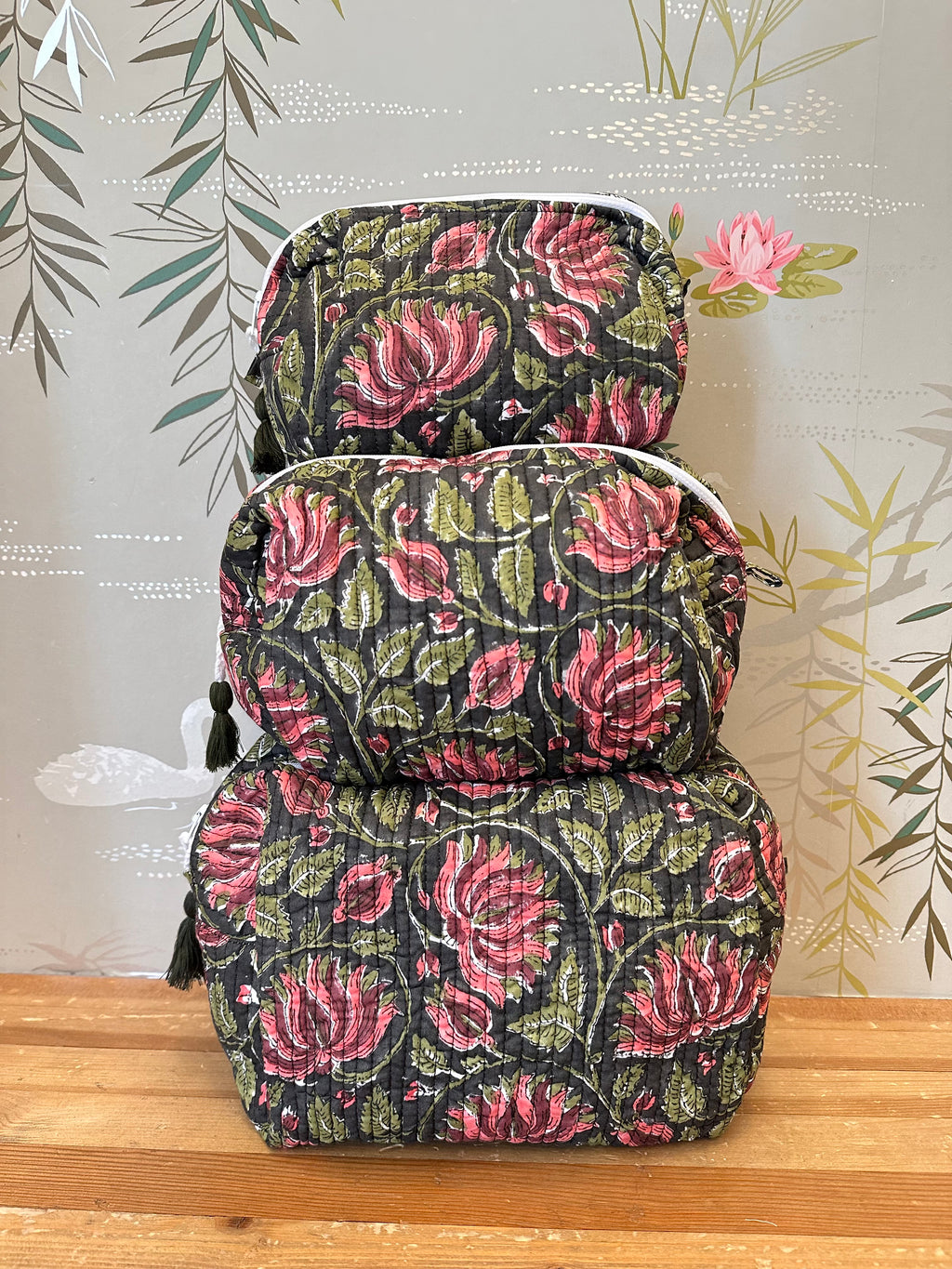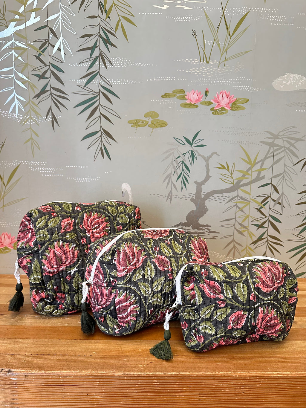 A three piece cosmetic bag set. Made by the same female owned factory in India that produces our home collection, each item is hand block printed. Interior has pockets and is lined for easy cleaning, complete with a tassel zipper.