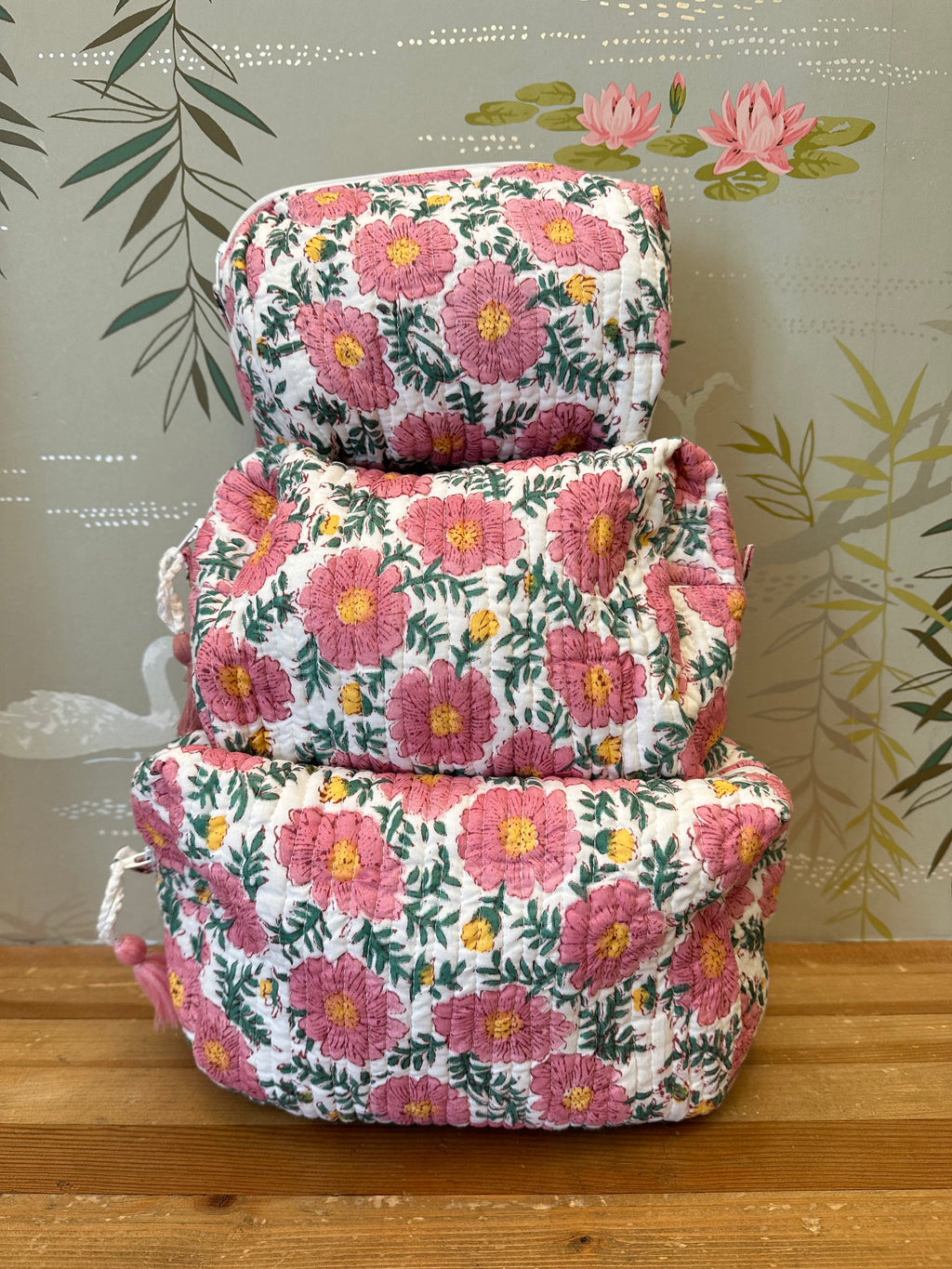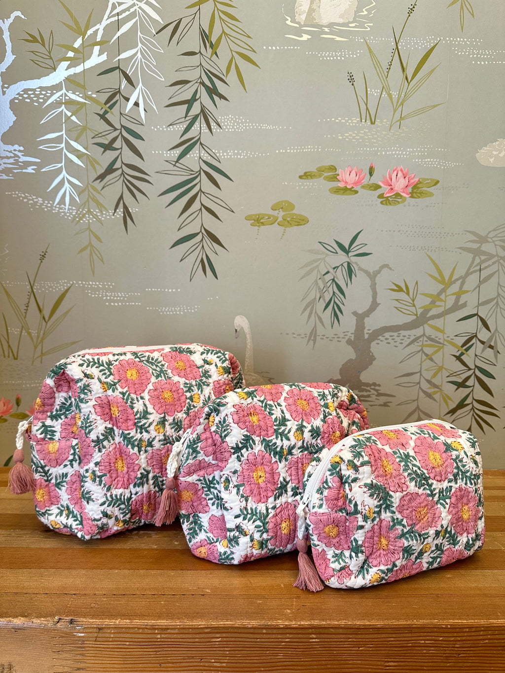 A three piece cosmetic bag set. Made by the same female owned factory in India that produces our home collection, each item is hand block printed. Interior has pockets and is lined for easy cleaning, complete with a tassel zipper.