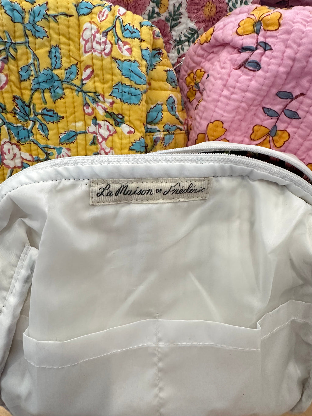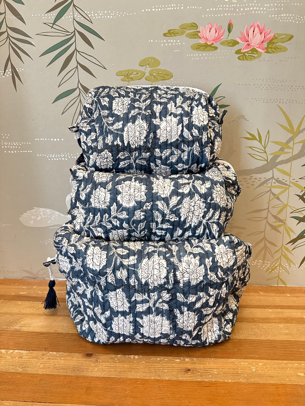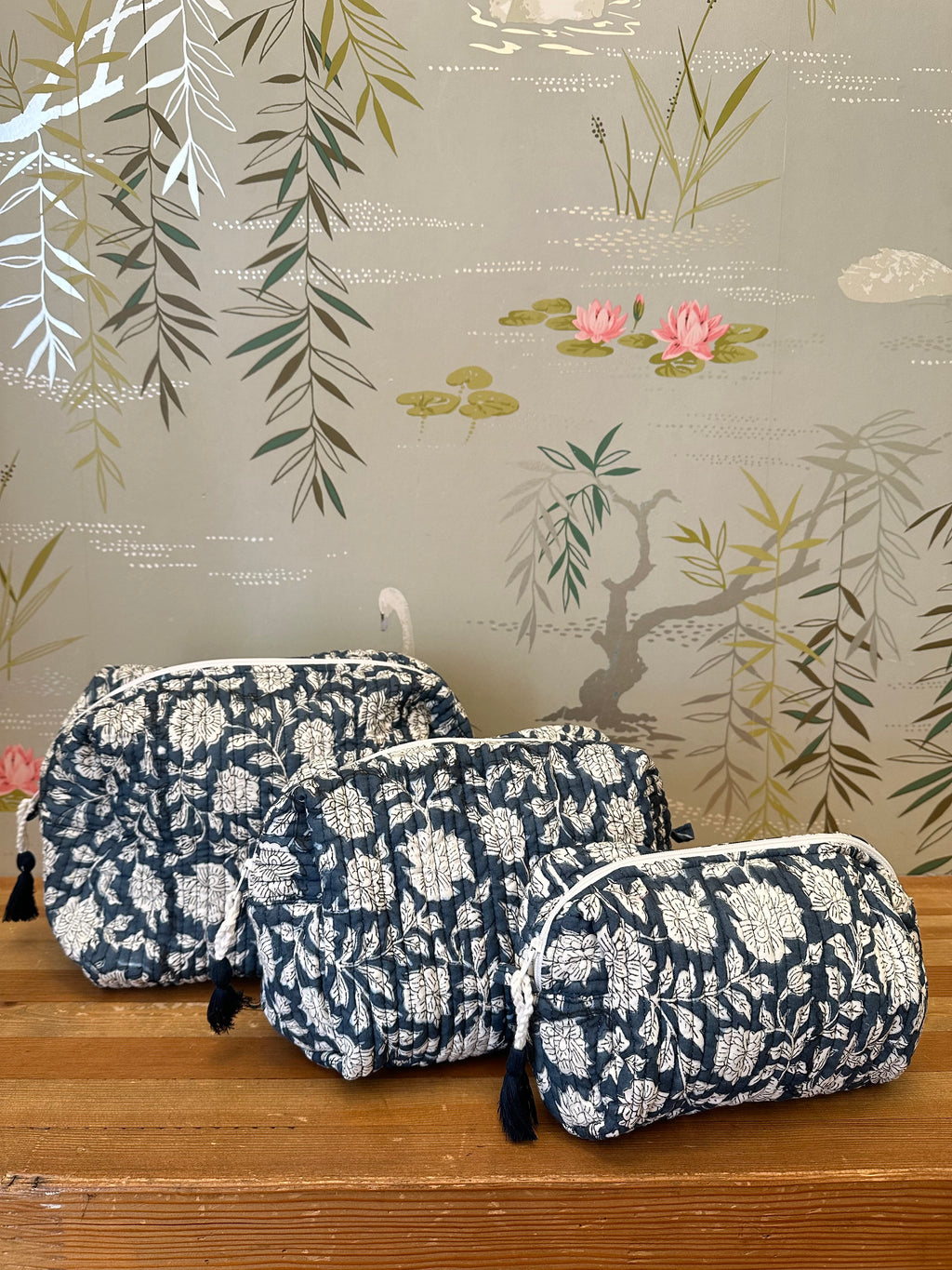 A three piece cosmetic bag set. Made by the same female owned factory in India that produces our home collection, each item is hand block printed. Interior has pockets and is lined for easy cleaning, complete with a tassel zipper.