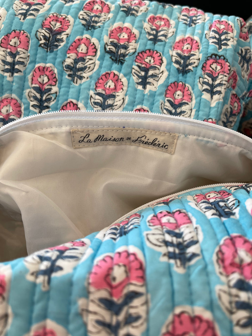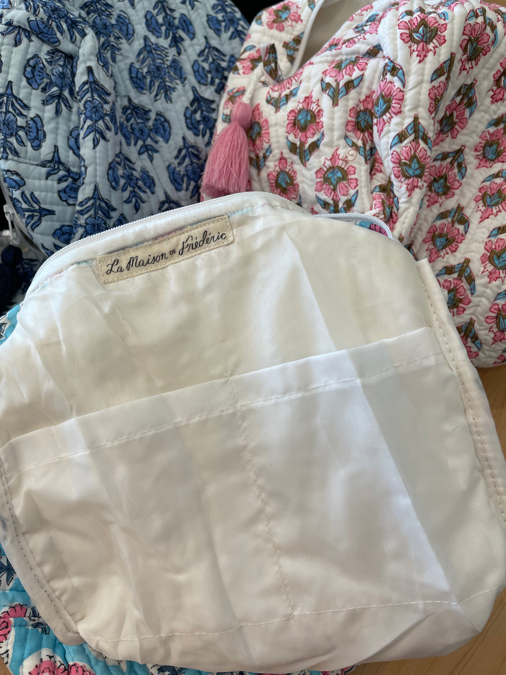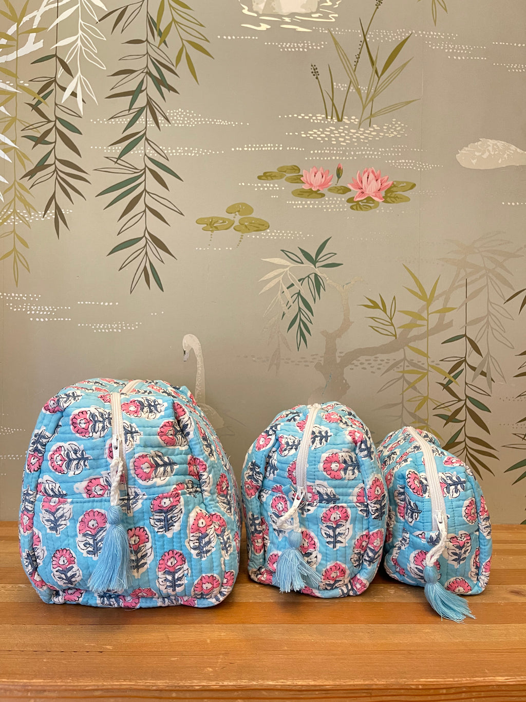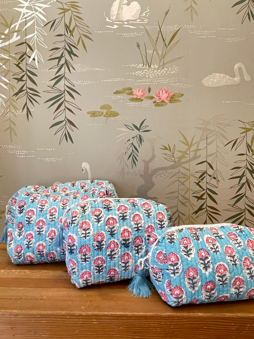 A three piece cosmetic bag set. Made by the same female owned factory in India that produces our home collection, each item is hand block printed. Interior has pockets and is lined for easy cleaning, complete with a tassel zipper.