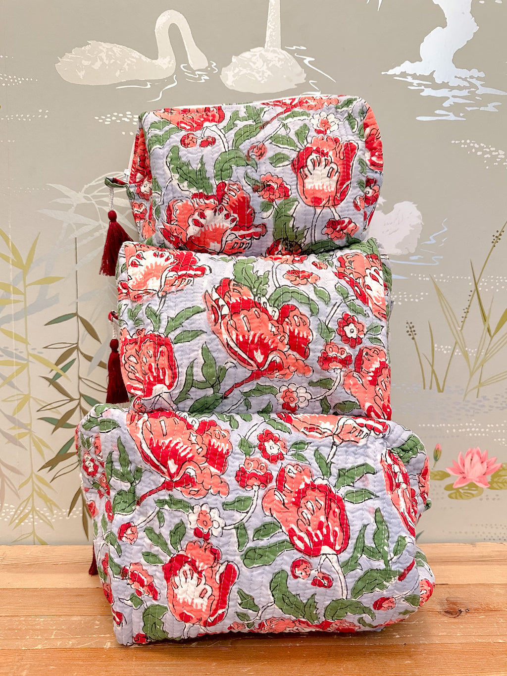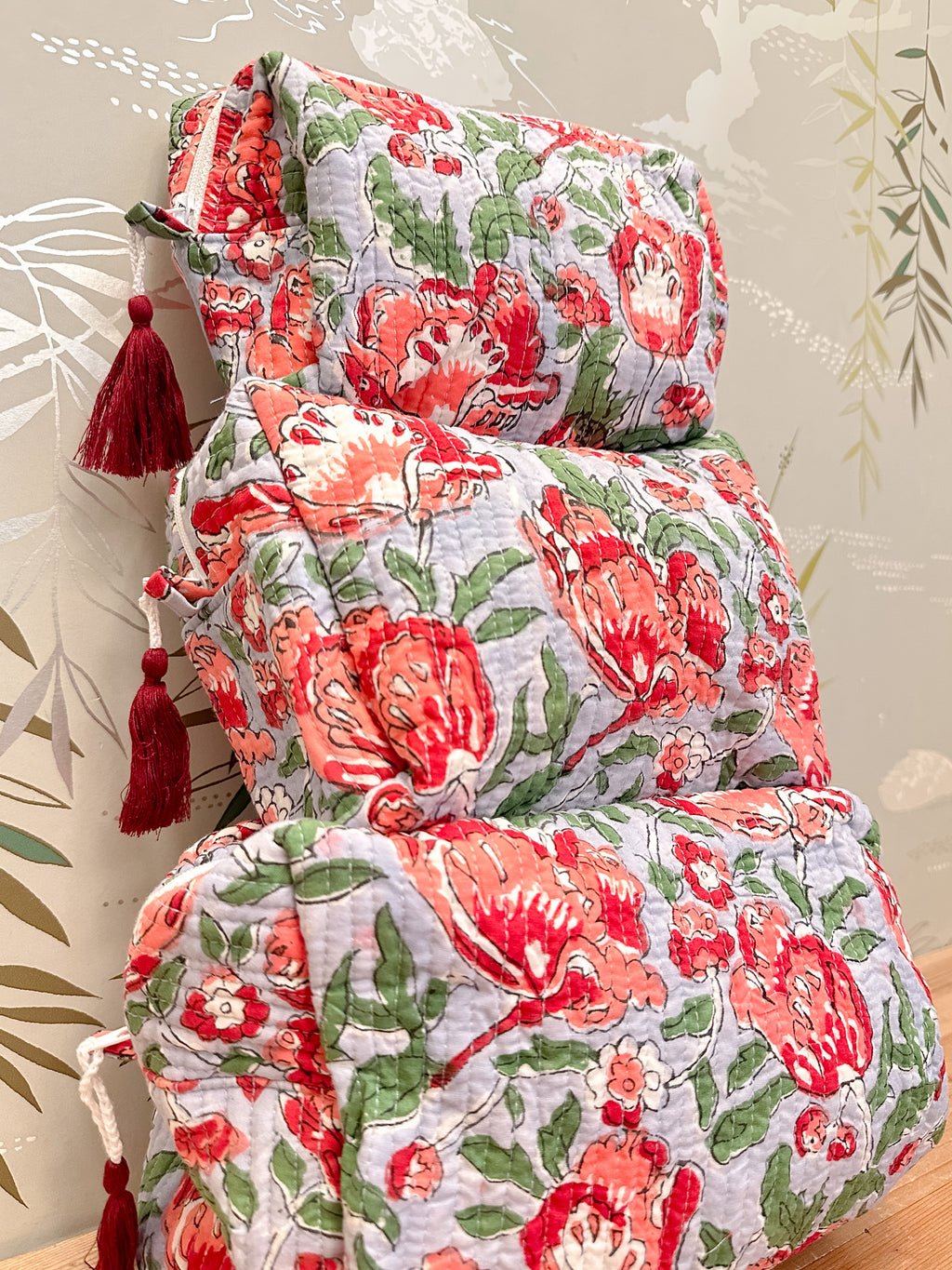 A three piece cosmetic bag set. Made by the same female owned factory in India that produces our home collection, each item is hand block printed. Interior has pockets and is lined for easy cleaning, complete with a tassel zipper.