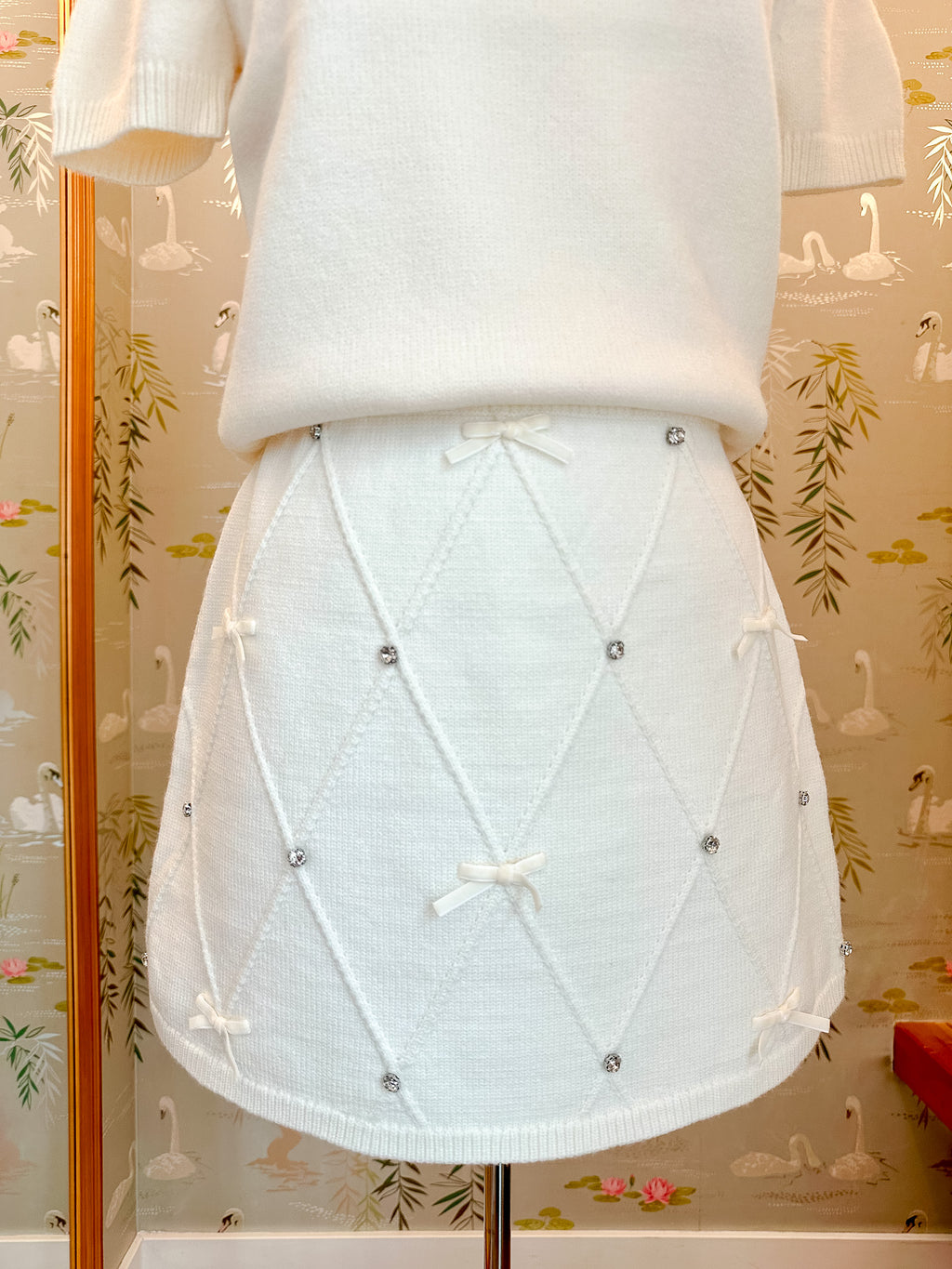 An ivory sweater mini skirt adorned with bows and rhinestones. A comfortable waist with a wide elastic waist. Style yours with tights for a chic winter look.