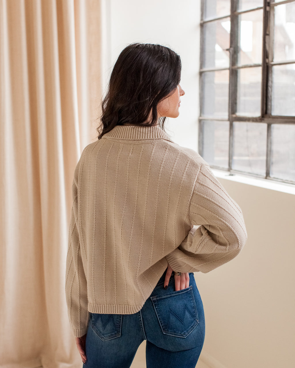A heavy knit cotton blend cardigan with front patch pockets, collar, and tonal knitted stripe details. Pair with denim or over a dress.