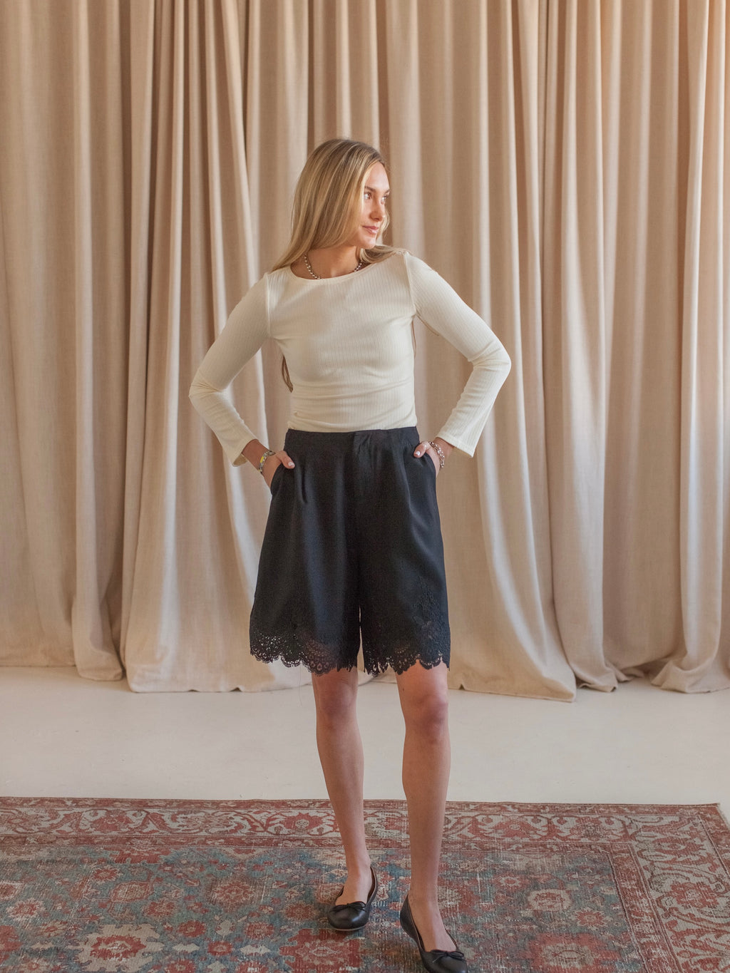 A staple for any season, these high rise shorts can be worn throughout the winter paired over tights with boots or flats and worn in warmer months with a white tee and sandals. Featuring front pleats, pockets, and ornate lace at the leg.