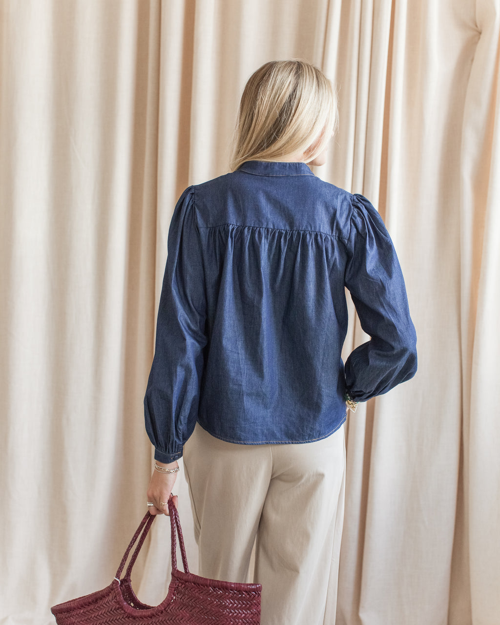 A button front puff sleeve chambray blouse with v-neckline and contrast stitching. Tuck into a high rise skirt like our Brooklyn Suede skirt for an easy fall look.