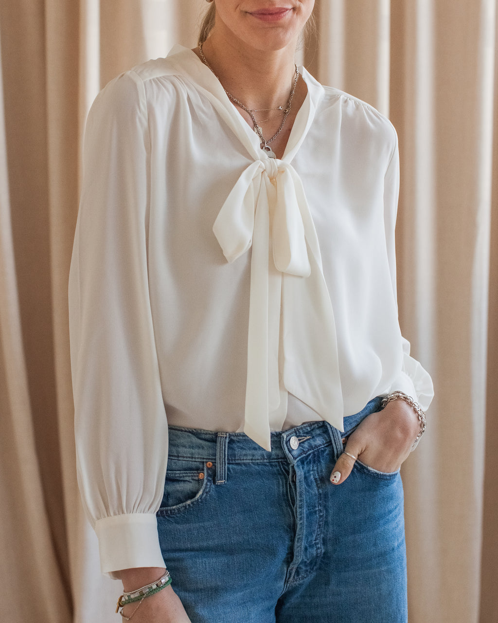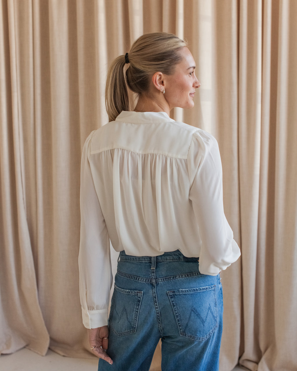 A flowy long sleeve button up blouse with self tie bow at neckline and shirring details around shoulders. Tuck into high rise denim or trousers.