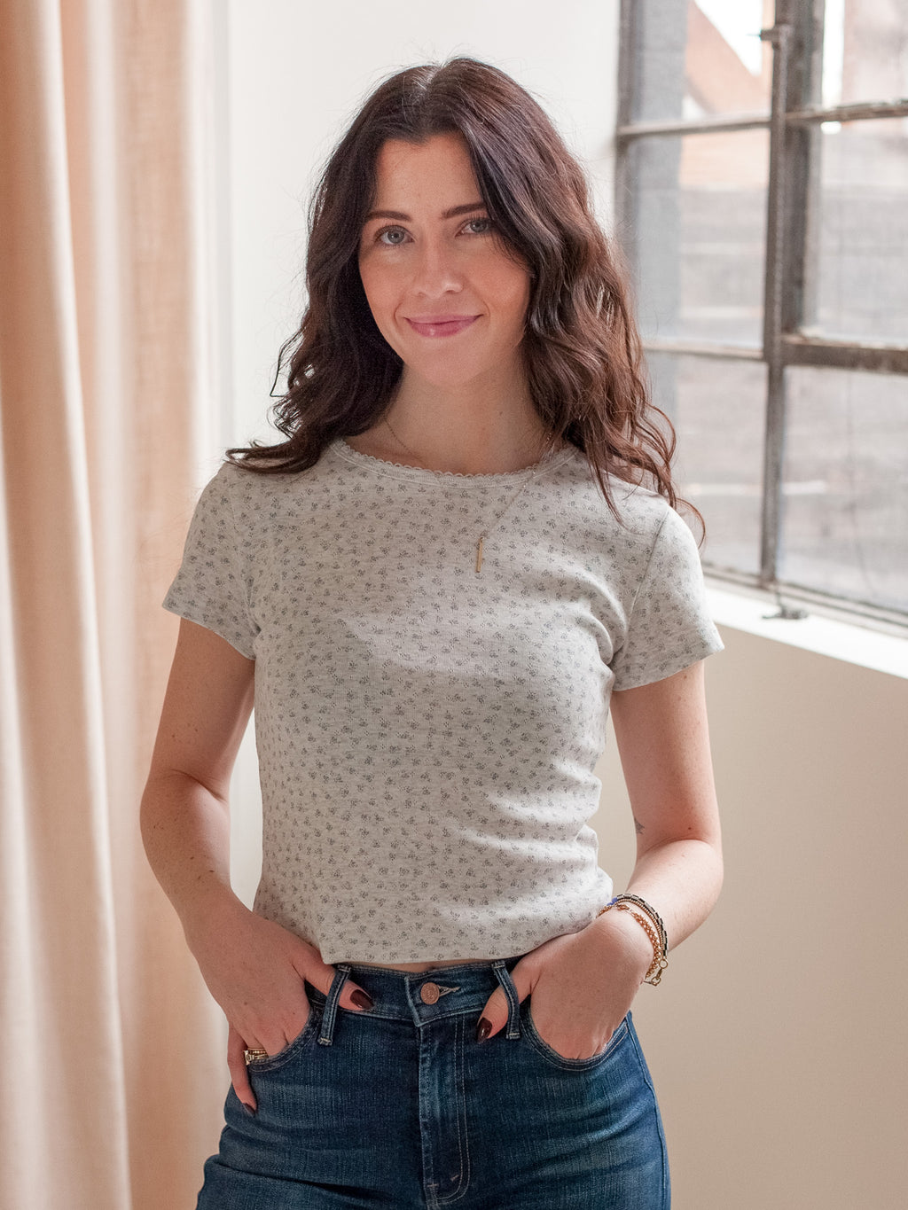 The perfect spring layering piece, this pointelle crewneck tee features a delicate floral pattern and lace trim at the neckline.
