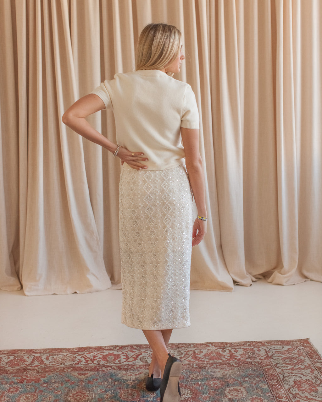 A knit midi length column skirt with delicate beading and sequin embellishments. Pair with the Hallie Bow Sweater for a complete festive look.