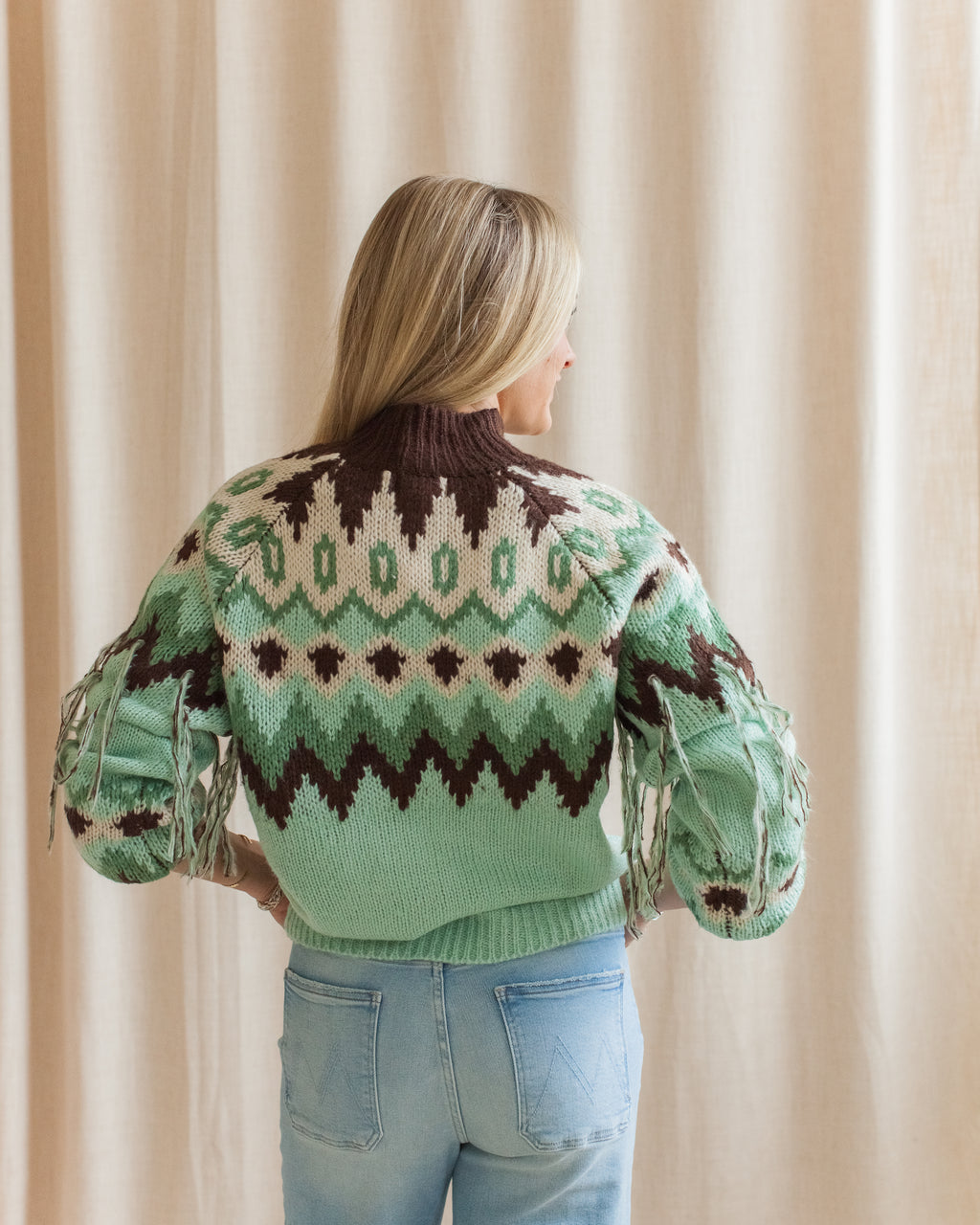 This knit fair isle pullover features a mock neckline, balloon sleeves, and fringe on arms. Pair with denim and white sneakers for an easy everyday look.