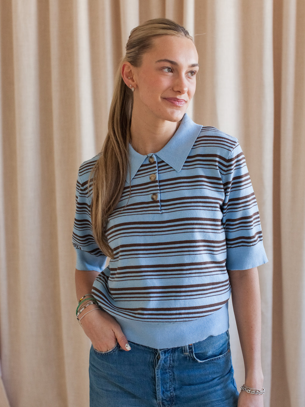 A knit short sleeve striped polo top with contrast collar, cuffs, and waistband. Also features buttons at neckline. Pair with denim or trousers this spring.