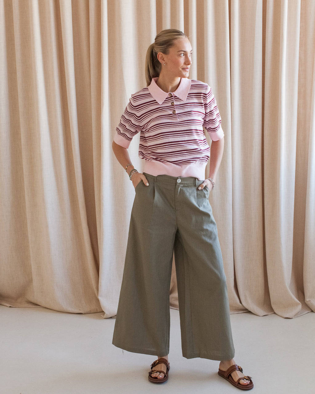 A knit short sleeve striped polo top with contrast collar, cuffs, and waistband. Also features buttons at neckline. Pair with denim or trousers this spring.