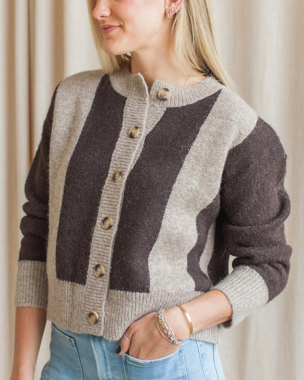 A cozy cardigan perfect for colder nights ahead. Featuring vertical stripes and ribbed detailing along the hem and cuffs for added comfort. Pair over a classic tee and denim.
