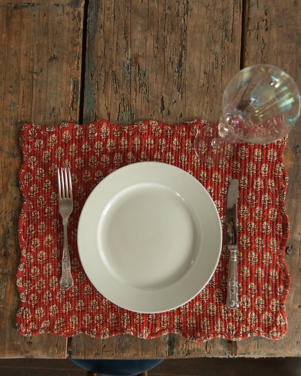 Custom hand block printed quilted placemats. Each placemat is lovingly handmade by a small female owned workshop. Comes in a set of 4.