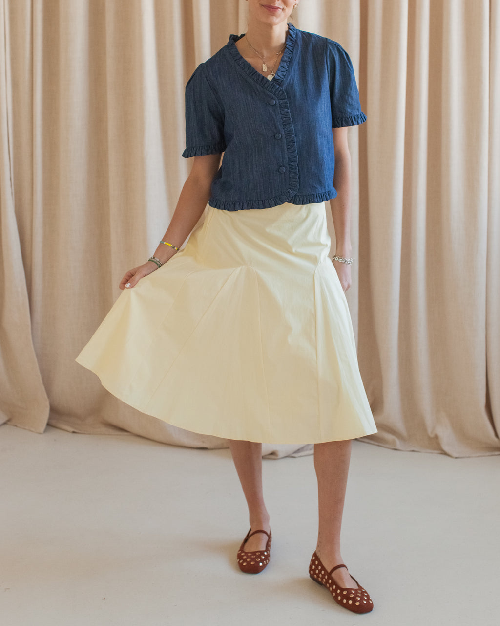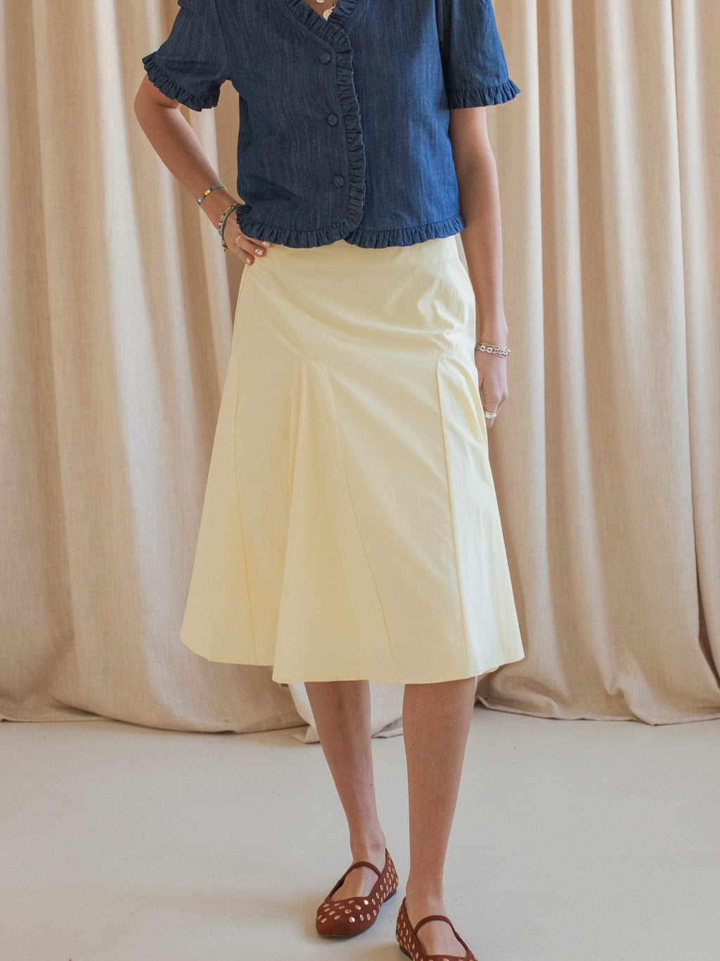 This butter yellow knee length poplin skirt features a full silhouette, full lining, and zip closure. Pair with a white tee and sandals.