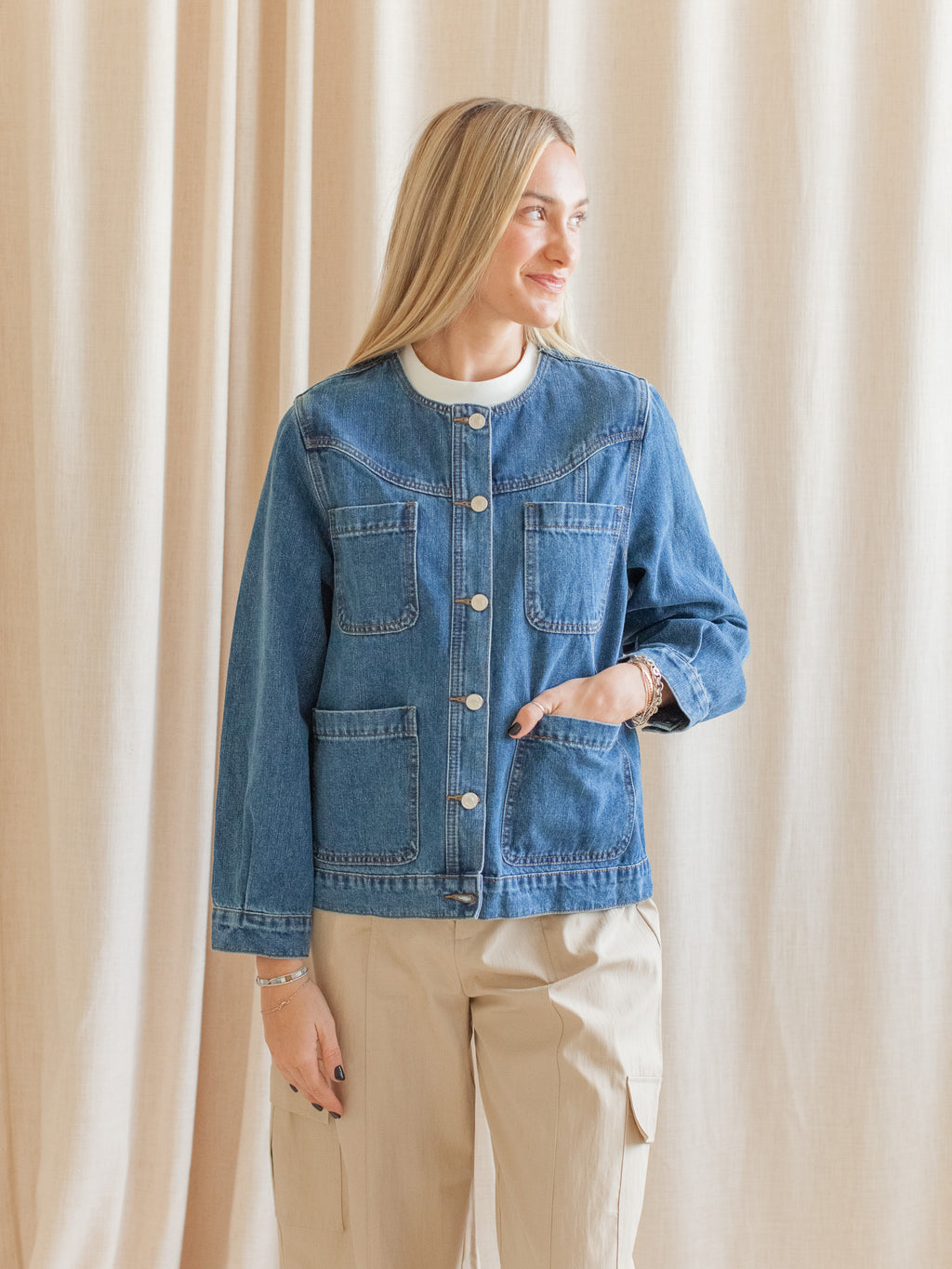 A relaxed denim jacket featuring a crew neckline and four functional pockets. This jacket can be paired over dresses, skirts, trousers or denim.