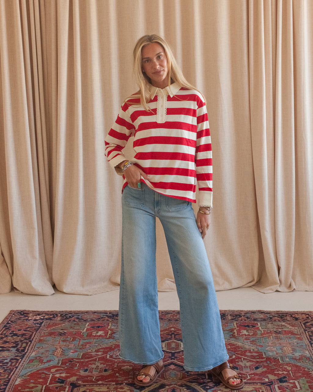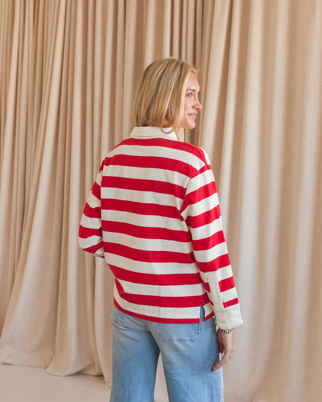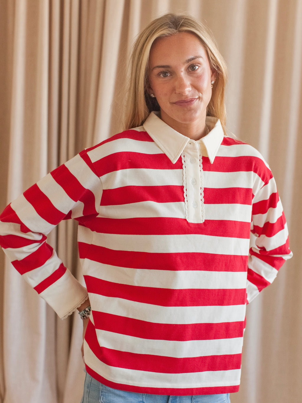 A 100% cotton striped rugby top with lace trim. Pair with your favorite denim and sneakers for an easy, everyday look.