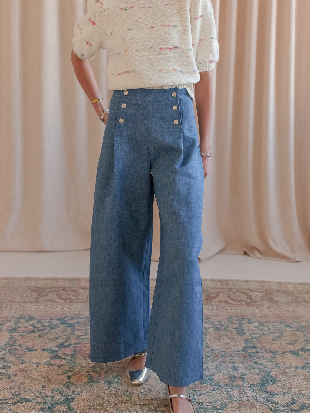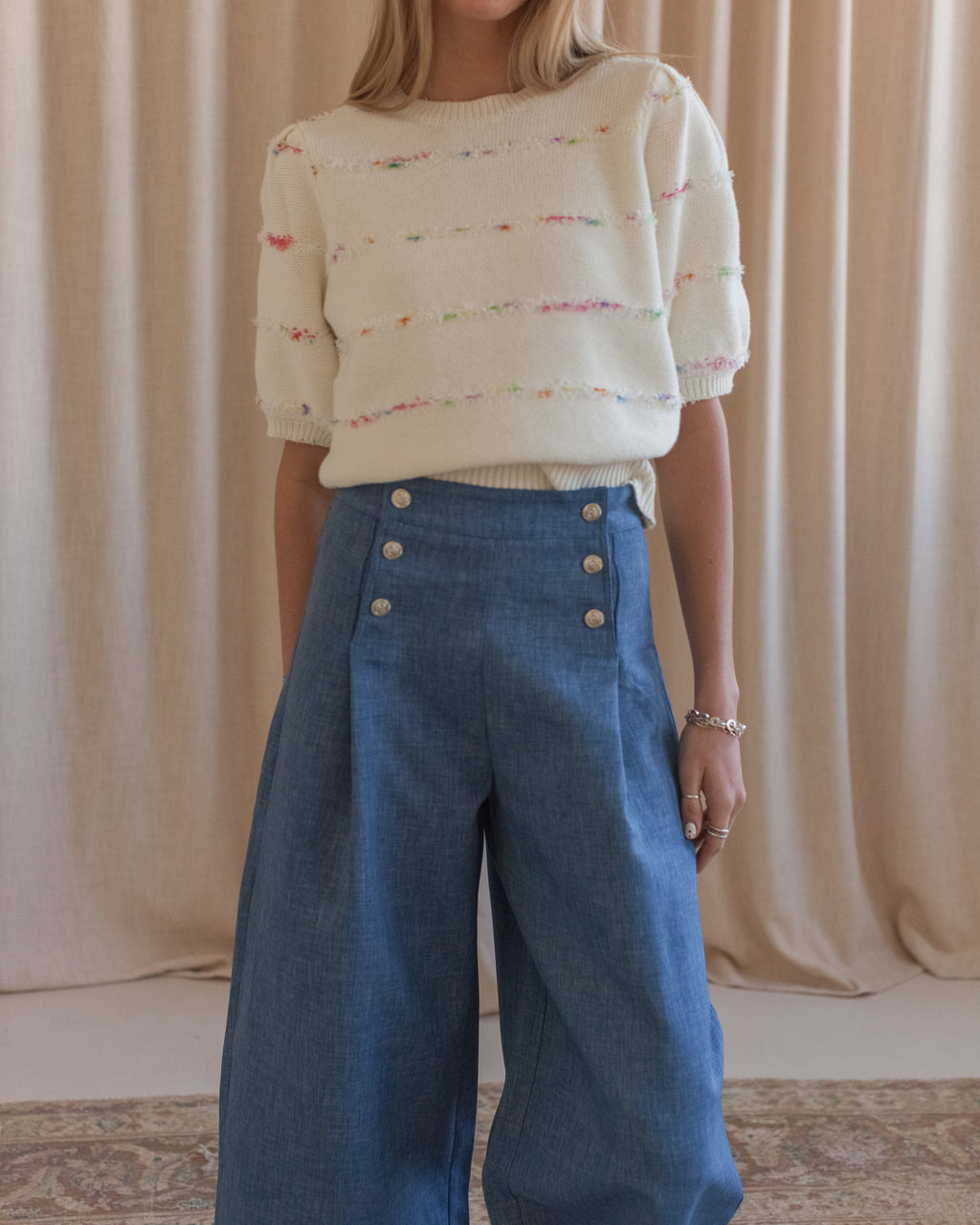 These high rise sailor style pants feature a long inseam, wide leg, contrasting gold buttons, and subtle front pleats. Pair with our Liza striped sweater or a white tee.