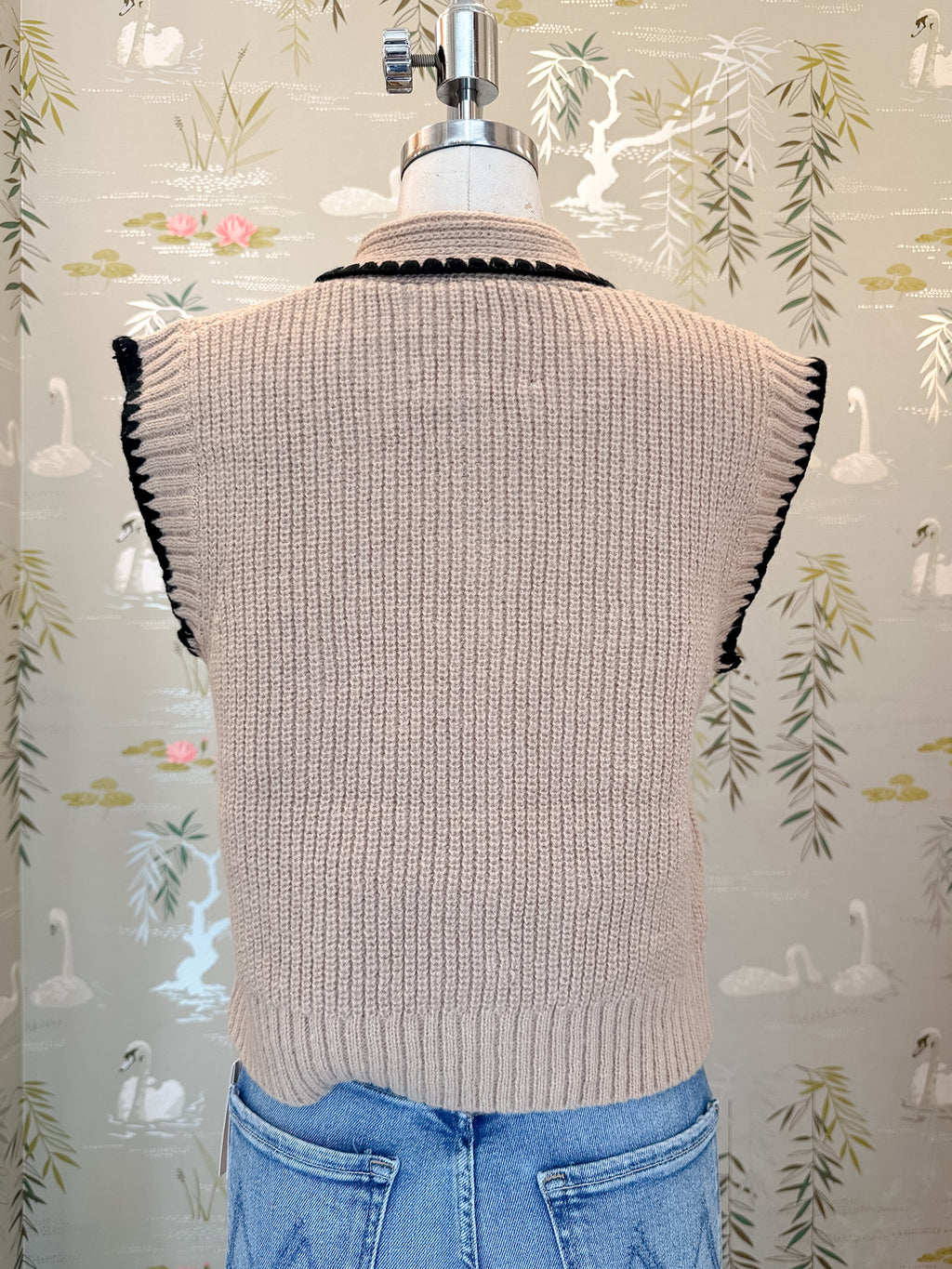 This sleeveless knit top features contrast embroidered edges, contrast buttons on the front, and a nautical inspired tie at the neckline. Wear on its own or pair over a long sleeve when the cooler temperatures arrive.