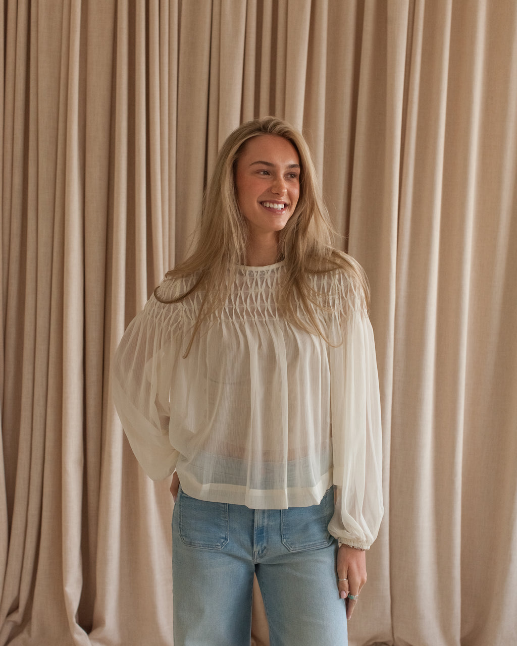A sheer, lightweight blouse with a softly smocked bodice and relaxed fit. Featuring a scoop neckline, long sleeves, and an easy drape for an effortless look.
