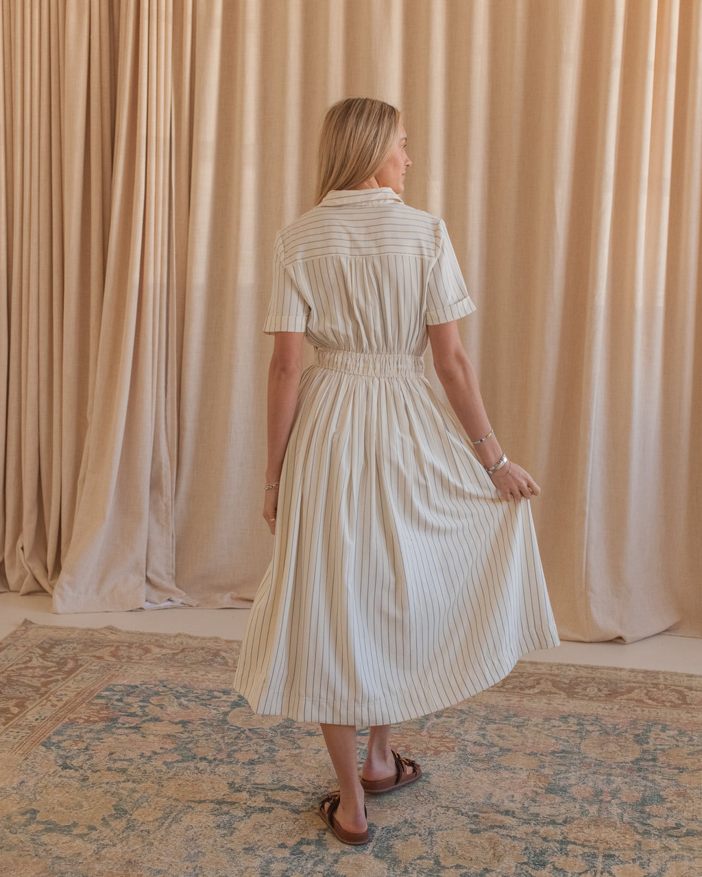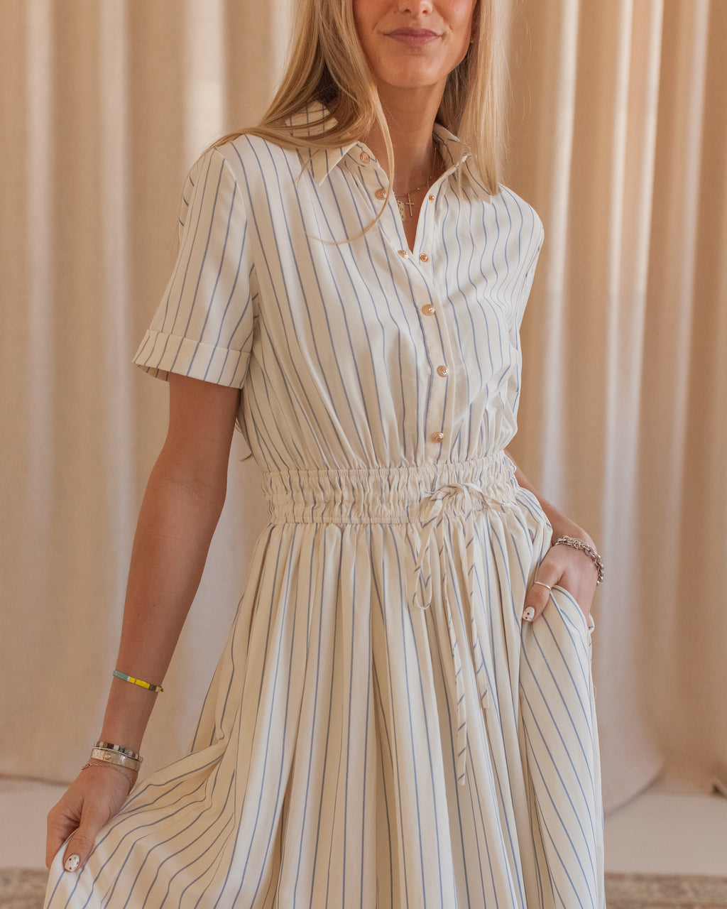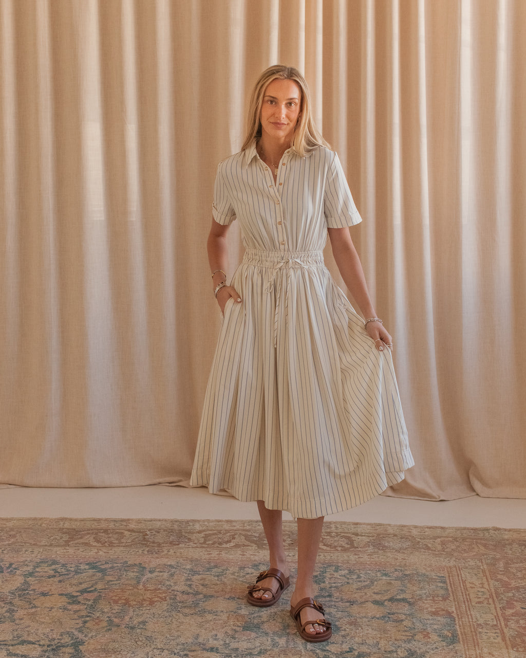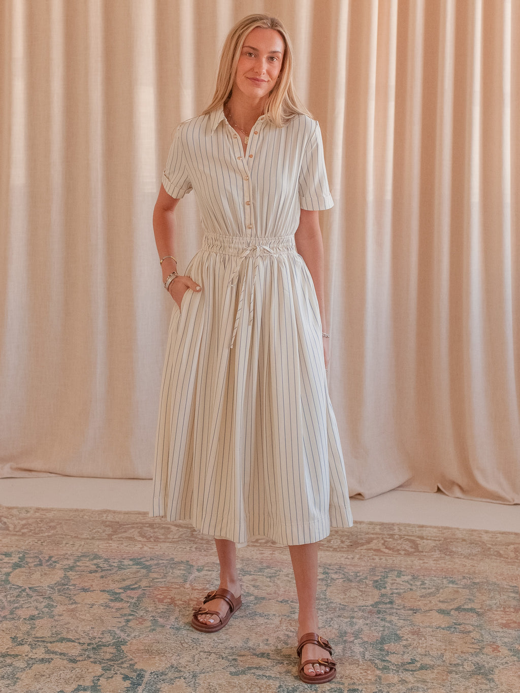 This striped midi shirtdress is constructed from a flowy, lightweight cotton and features an adjustable fitted waist, pockets, gold buttons, and a collar. Pair with sandals and a leather tote for warm days.