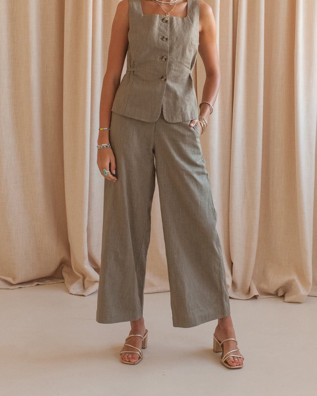 These high rise wide leg trousers constructed from linen and cotton are the perfect addition to any wardrobe. Features front and back pockets, belt loops, and a partially elasticized waistband for added comfort. Pair with our Taylor linen vest or a white tee.
