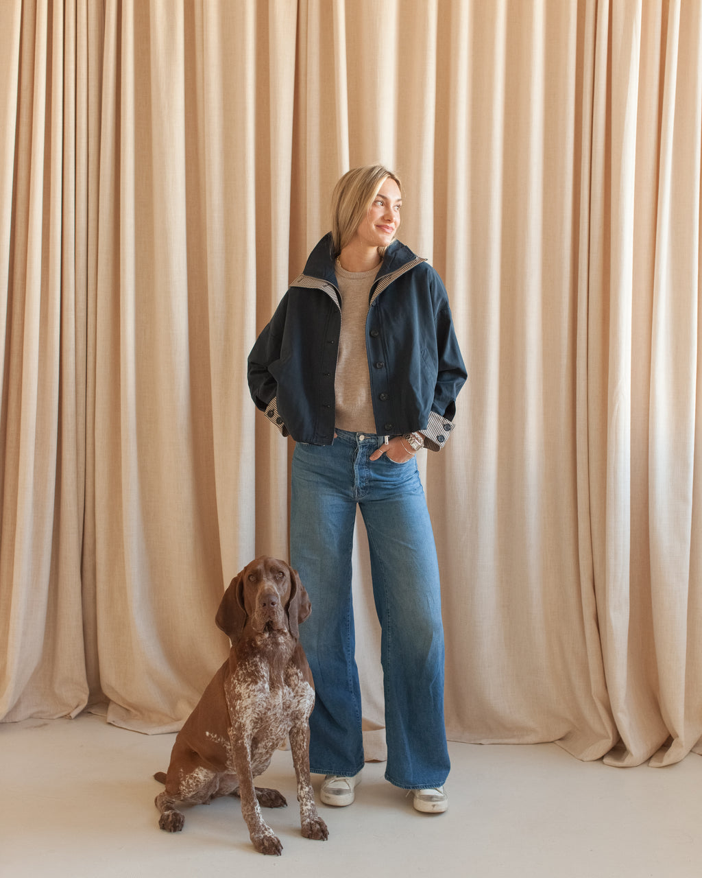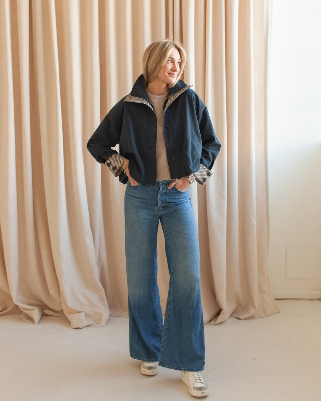 A modern classic with a twist, this navy cropped jacket features contrast houndstooth lining at the collar and cuffs for added detail. Designed with a structured silhouette, front zip and button closures, and tailored seams for a flattering fit. Perfect for layering through transitional seasons with effortless style.